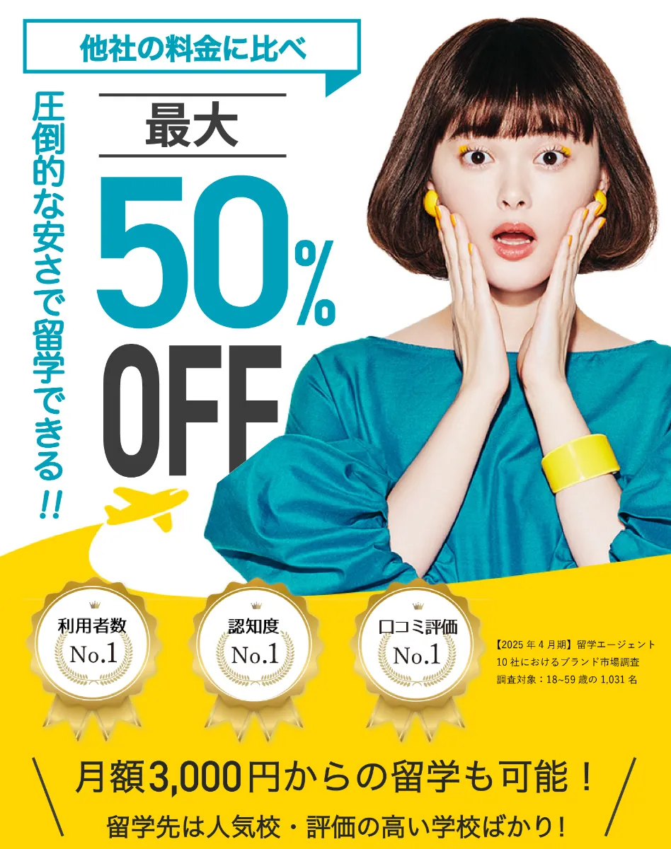 授業料・滞在費・教材費・入学金・諸手続き費用込みになり、他社に比べて最大半額です!!