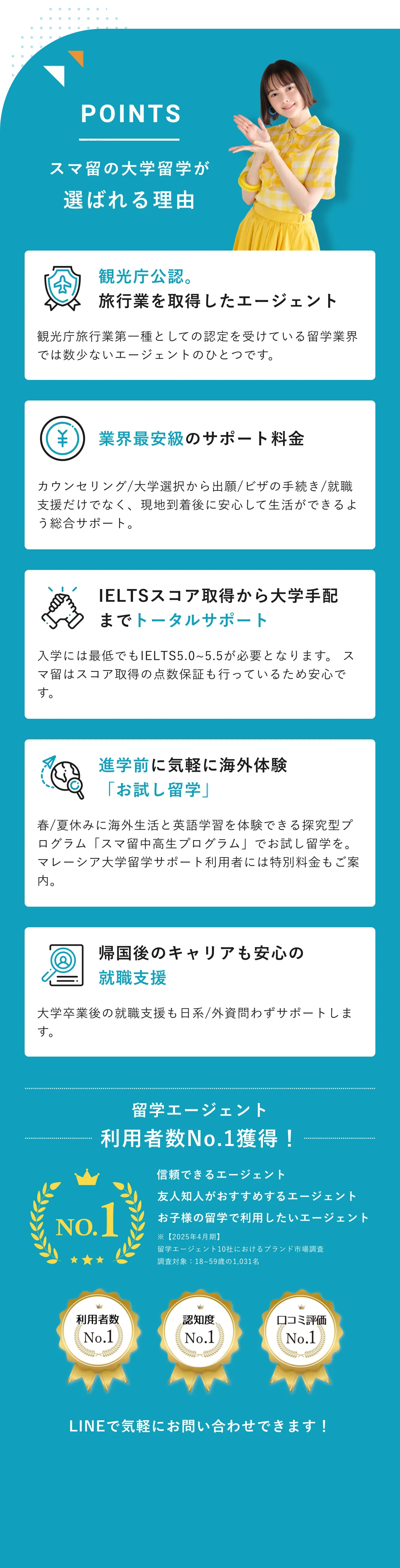 そのイメージに近づくために大学で何を学べば良いかを洗い出し、それらを学べる学校を探すことで自身に合った学校を選ぶことが良いでしょう。 マレーシア大学留学 Produced by スマ留では、専任カウンセラーが学校選びから入学手続きや準備までしっかりマンツーマンでサポートします。少しでも不安なことがあれば気軽にご相談ください。